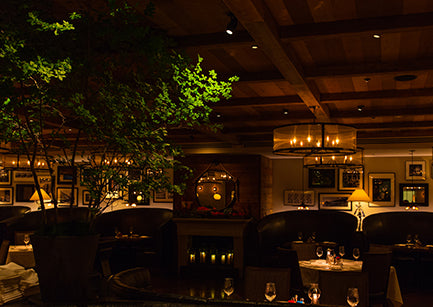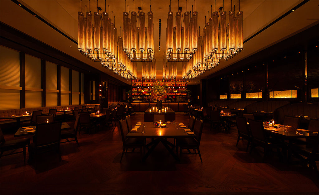 AKASAKAロウリーズ・ザ・プライムリブ赤坂国際的なビジネスエリアにある赤坂店は、ビジネスエリートの会食にもそぐうよう都会的で洗練されたインテリアをテーマにしています。天井高が7mある220席のメインダイニングの中央には、ペンダントタイプの象徴的なシャンデリアが配置され、大ぶりのプランツデコレーションと共にダイナミックな空間を創出しています。シャンデリアと卓上のキャンドルは、各テーブルにエレガントな雰囲気を演出しています。 -