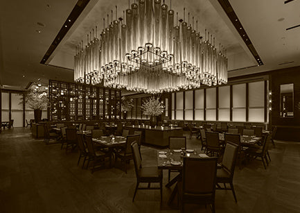 AKASAKAロウリーズ・ザ・プライムリブ赤坂国際的なビジネスエリアにある赤坂店は、ビジネスエリートの会食にもそぐうよう都会的で洗練されたインテリアをテーマにしています。天井高が7mある220席のメインダイニングの中央には、ペンダントタイプの象徴的なシャンデリアが配置され、大ぶりのプランツデコレーションと共にダイナミックな空間を創出しています。シャンデリアと卓上のキャンドルは、各テーブルにエレガントな雰囲気を演出しています。 -